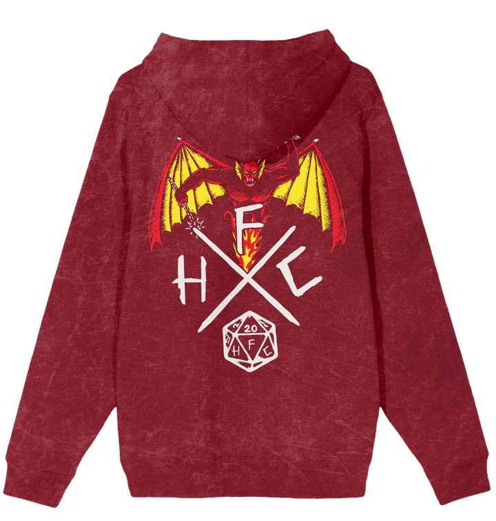 - Custom Design: Features a demon head with swords and Hellfire Club text on the front, plus a winged devil with X, HFC, and D20 dice on the back for a striking, series-inspired look